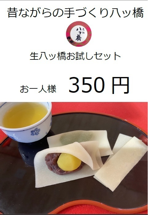 お試しセット【清水店限定】 お試しセットとは 元祖西尾為忠商店の生八つ橋をお試しいただく商品です セット内容例(季節により変更がございます) まるっぽ栗:1枚 抹茶餡:1枚 生八つ橋:2枚 玄米茶:1杯 お一人様:350円 どうぞよろしうに